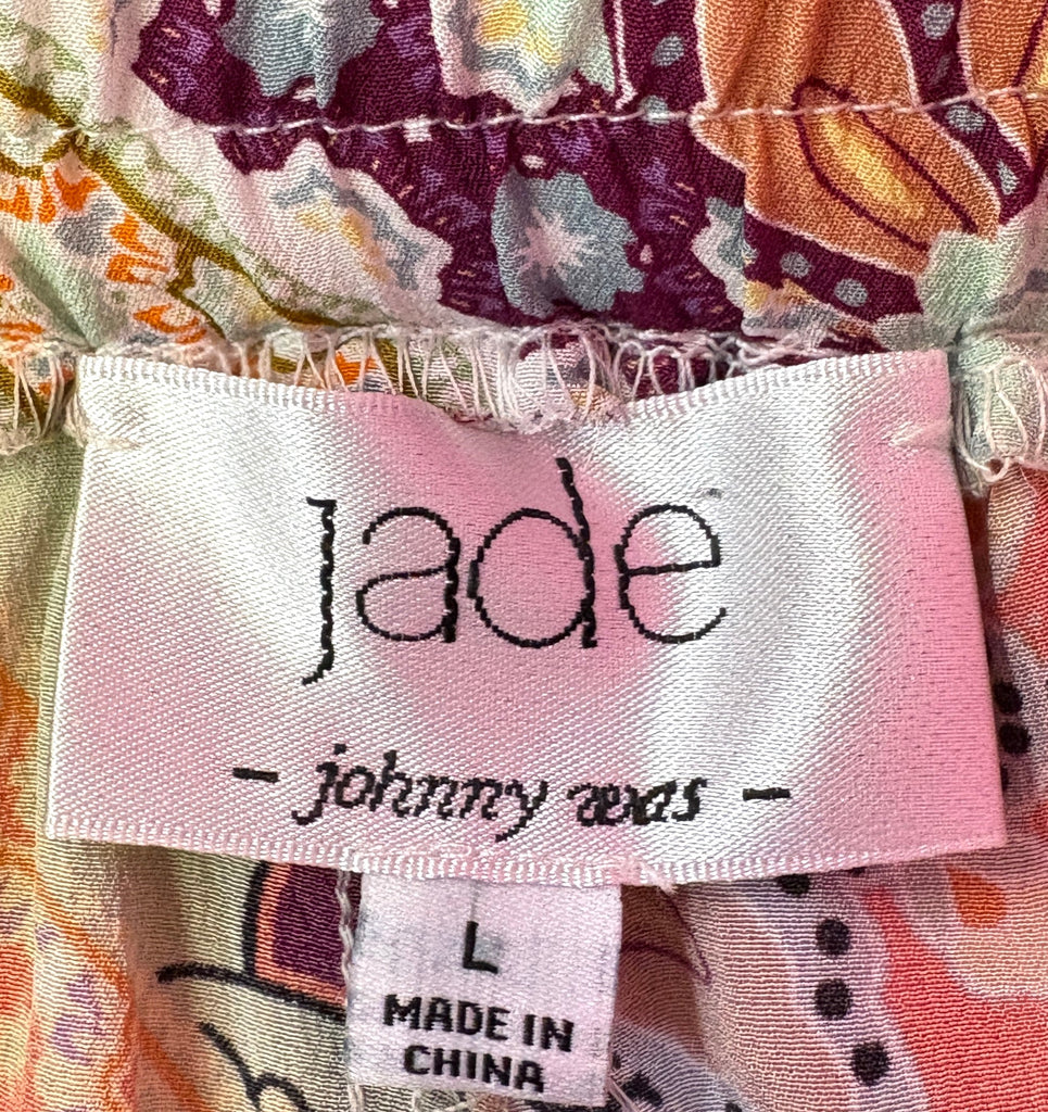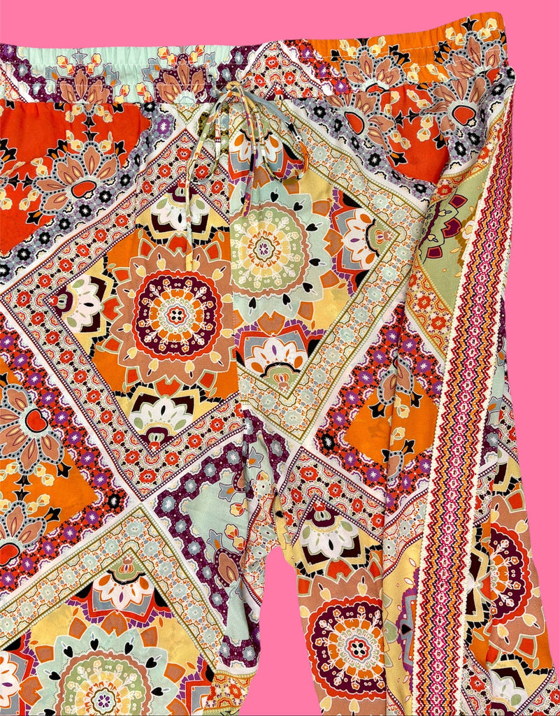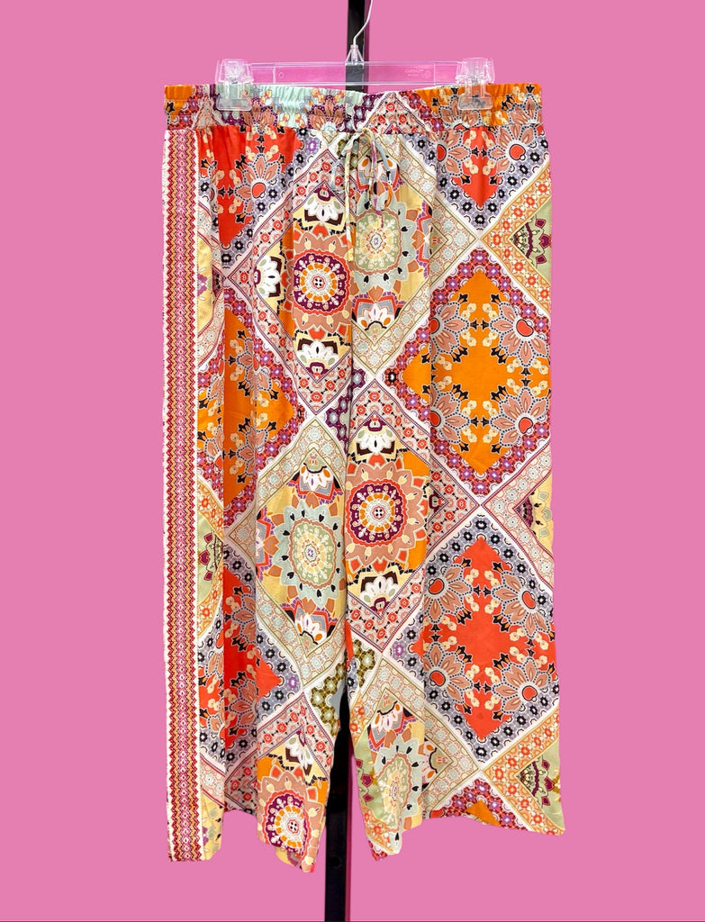 FEATURES: Fabulous Johnny Was Jade Lucero Pants crafted of 100% Premium Silk in a bohemian patchwork pattern. Capri length, drawstring waistline and tuxedo stripe at the side (See Pic). This is what we call Comfortable, Casual & Fabulous!!! Original Retail $298.