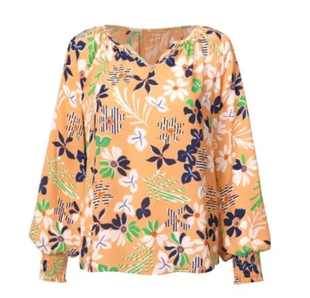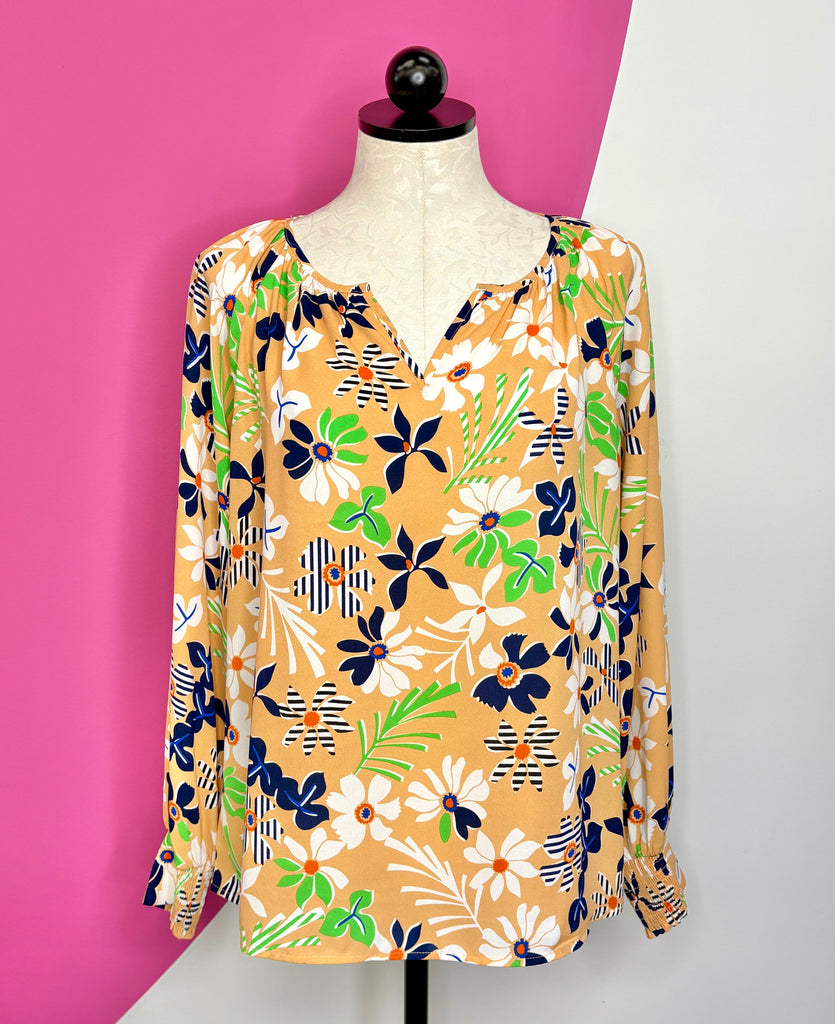 FEATURES: From the 2023 Cabi Collection comes the Island Blouse (#6296), featuring a floral geometric pattern, long cap sleeves, and a ruffle accent. Perfect for office or play with its fun print, split neckline, longer length and relaxed fit. Made from 100% Polyester. Original Retail $129.