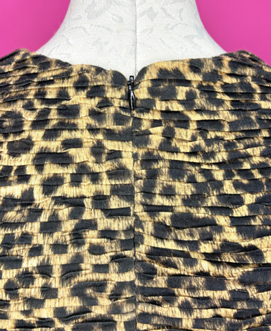 FEATURES:   Take a Walk on the Wild Side with this Designer Ronny Kobo Kaitlyn Dress. Animal Print puckered jersey dress featuring a flattering scoop neckline and subtle cap sleeves, finished with an asymmetrical hem and a hidden back zipper.  This mini dress offers a sleek, modern silhouette with a touch of bold style. Tag Size Large, but based on measurements, this item will best fit a Ladies size small. Original Retail $450.