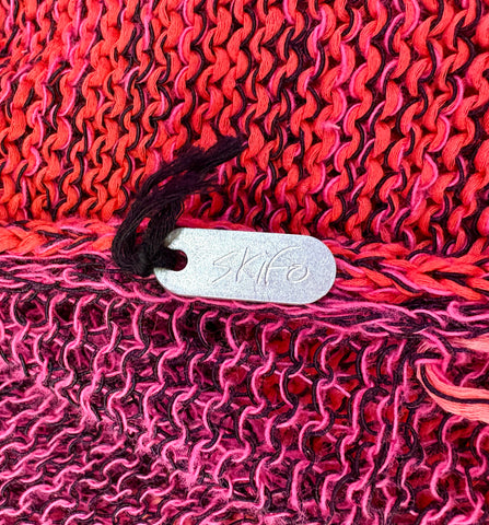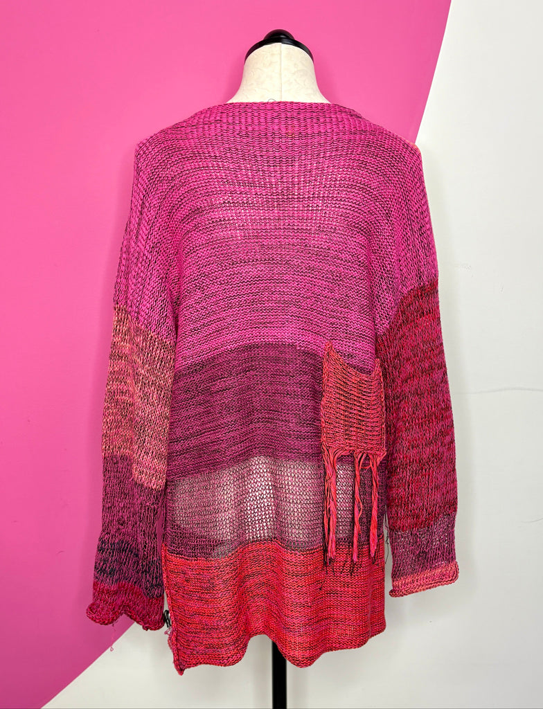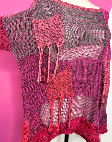 FEATURES: This striking SKIFO “art-to-wear” knit top showcases a rich blend of pink, magenta, and berry tones in an open-weave, patchwork-inspired design. Crafted with intentional texture variation, it features deconstructed knit panels, asymmetric draping, and fringe accents that give it a bold, avant-garde look. The relaxed oversized silhouette and lightweight feel make it perfect for layering and statement styling. Honestly, this sweater can be worn by anyone who from a Size Small - XL. Original Retail $400.