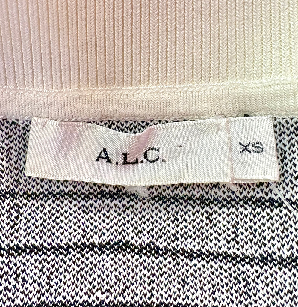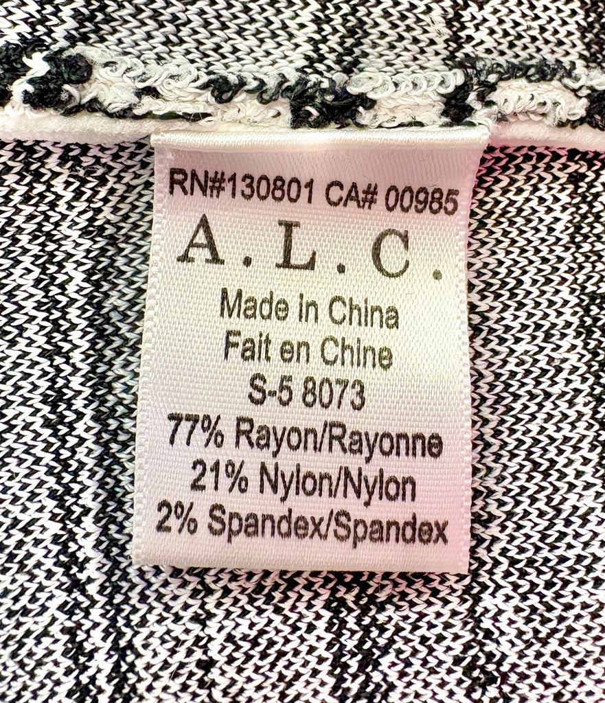 FEATURES: This A.L.C. “Lyons” skirt in size XS features a modern black-and-white asymmetric stripe intarsia knit with a soft, stretchy waistband for a comfortable, flattering fit. Designed in a sleek mid-length pencil silhouette, it offers flexible movement and a polished look perfect for work, events, or elevated everyday style. Original Retail $350.