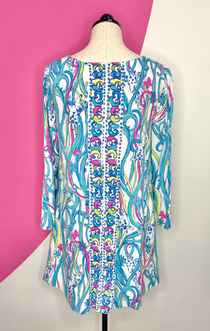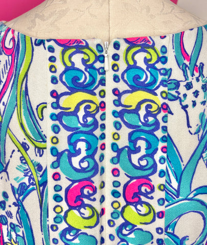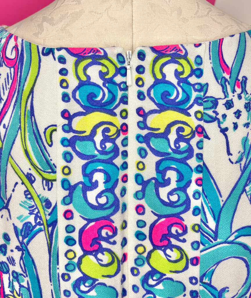 FEATURES: Step into resort-ready elegance with this Lilly Pulitzer Colette dress, featuring a striking palette. Look closely and you will see that there are giraffes peeking out among the colorful grassy swirls. The long sleeves and crew neck design offer a classic touch, while the sheath style and hidden zipper up the back ensure a flattering fit. Perfect for casual outings, this dress combines comfort with a chic, sophisticated look. 100% Rayon. Original Retail $198.