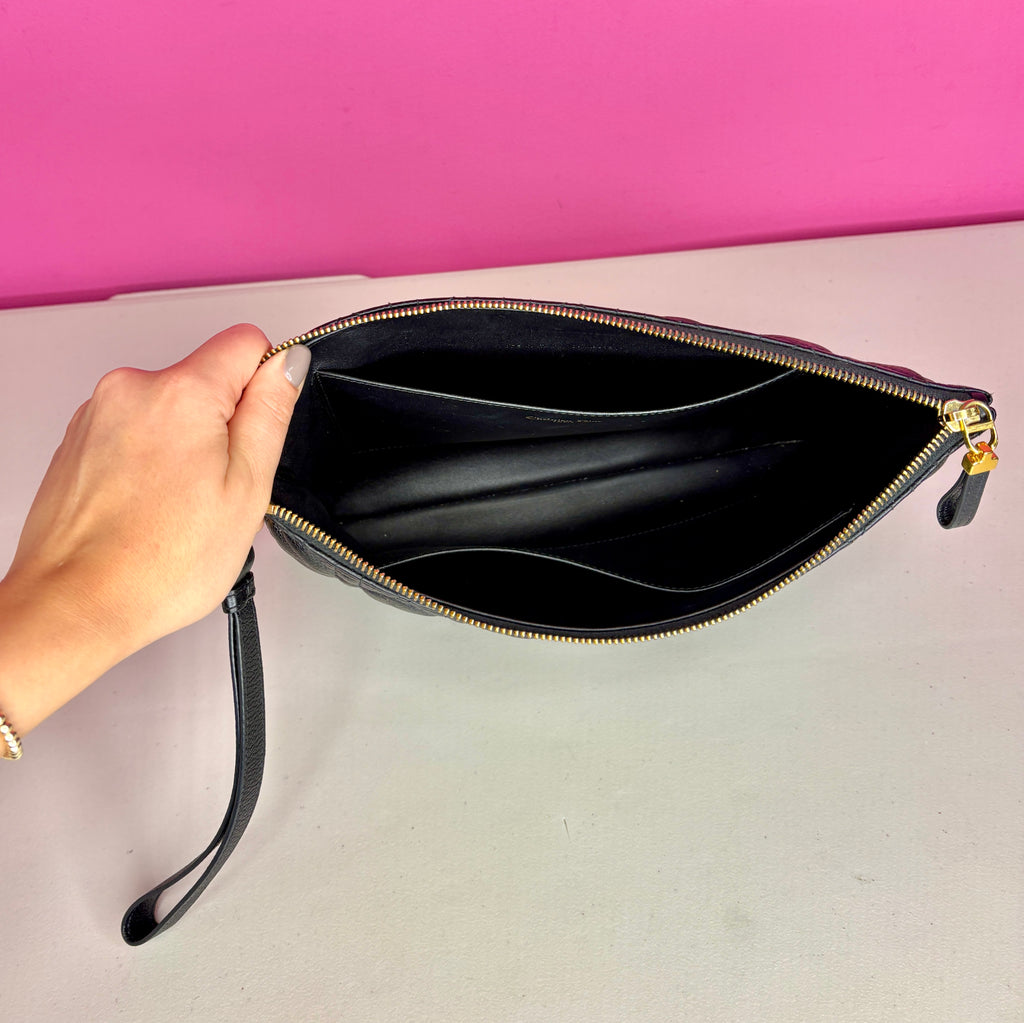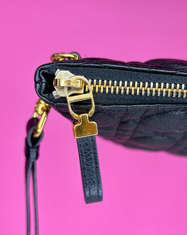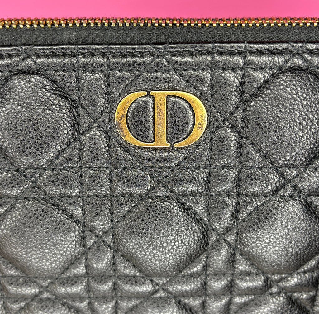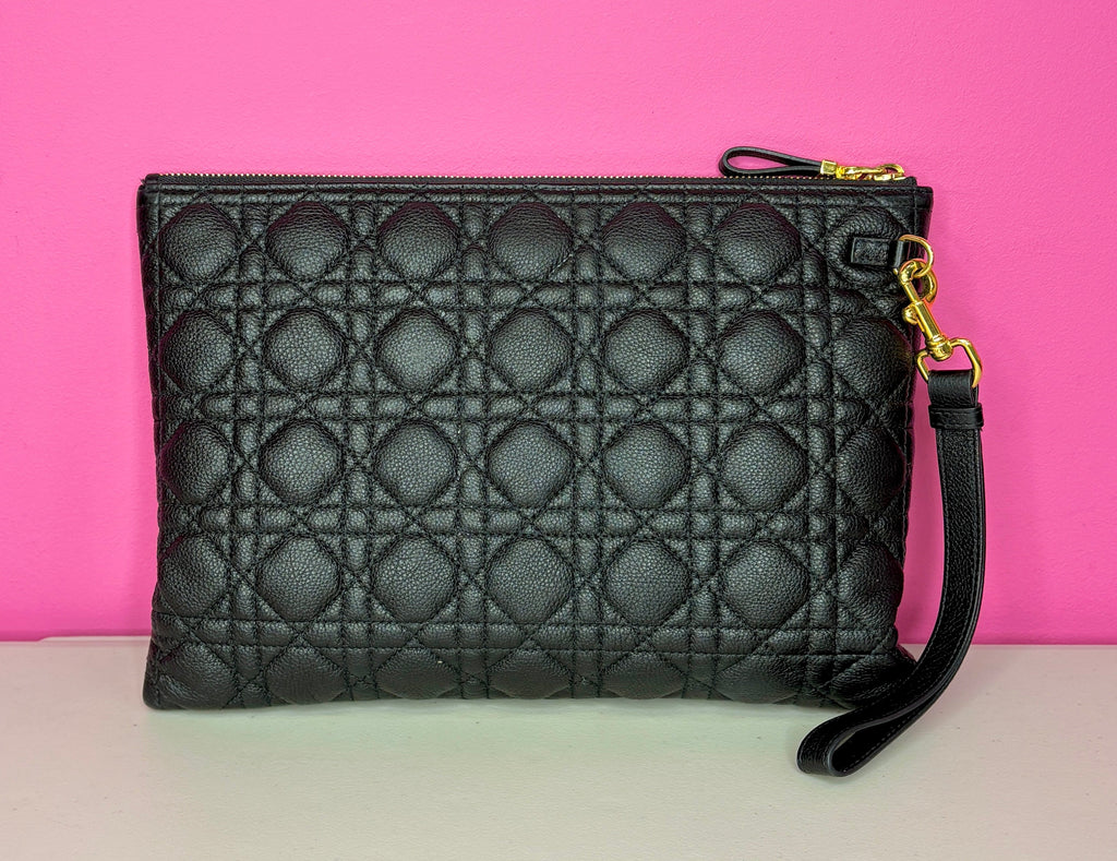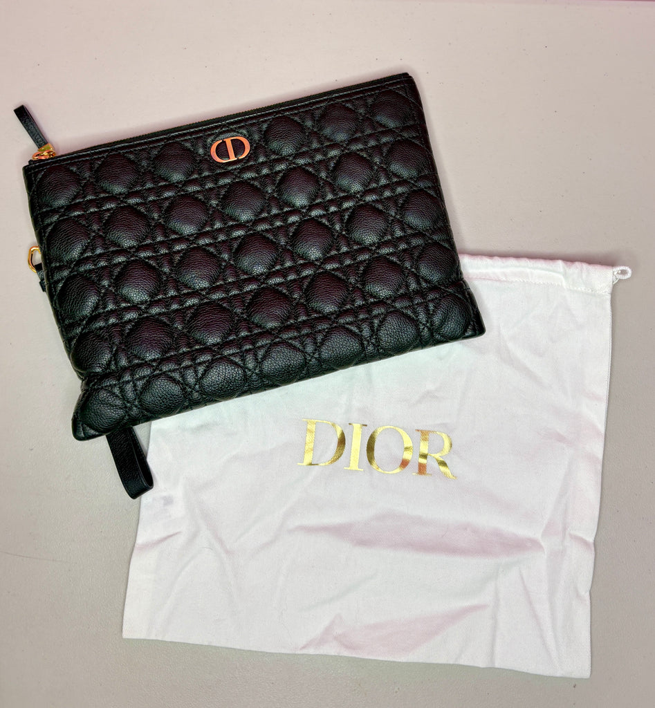 FEATURES: The Dior Caro Daily pouch is an elegant and practical accessory. Crafted in black supple calfskin, the design is embellished with hallmark Cannage topstitching and a CD signature on the front. The large pouch can hold all the essentials, while the removable wrist strap allows it to be carried by hand or slipped into a bag. Original Retail $1,500 as seen on Dior Site. (See Pic Below)