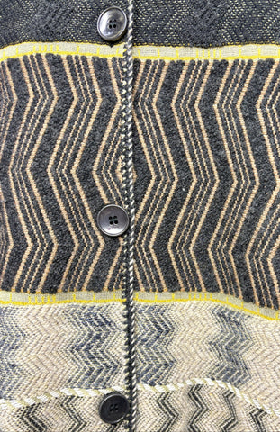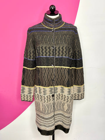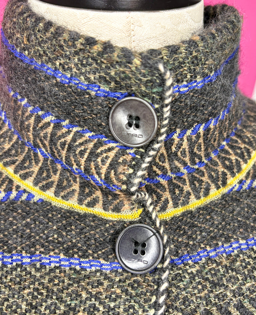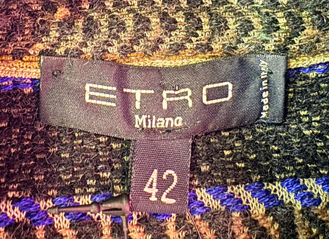 FEATURES:  This Etro Jacket would be a Cozy Classic addition to your wardrobe!  This Couture Knit is made of a a soft combination of 40% Cashmere; 40% Silk; 10% Wool; 7% Cotton; 2% Viscose; 1% Polyamide in hues of brown, cream, blue and yellow. Large ETRO Button Front, mock neck, long sleeves and longer duster length makes this piece super versatile. Can be worn closed or open with jeans or boots. Tag Size 42, which based on its oversized fit & measurements will work for both a Ladies Size Small & Medium.