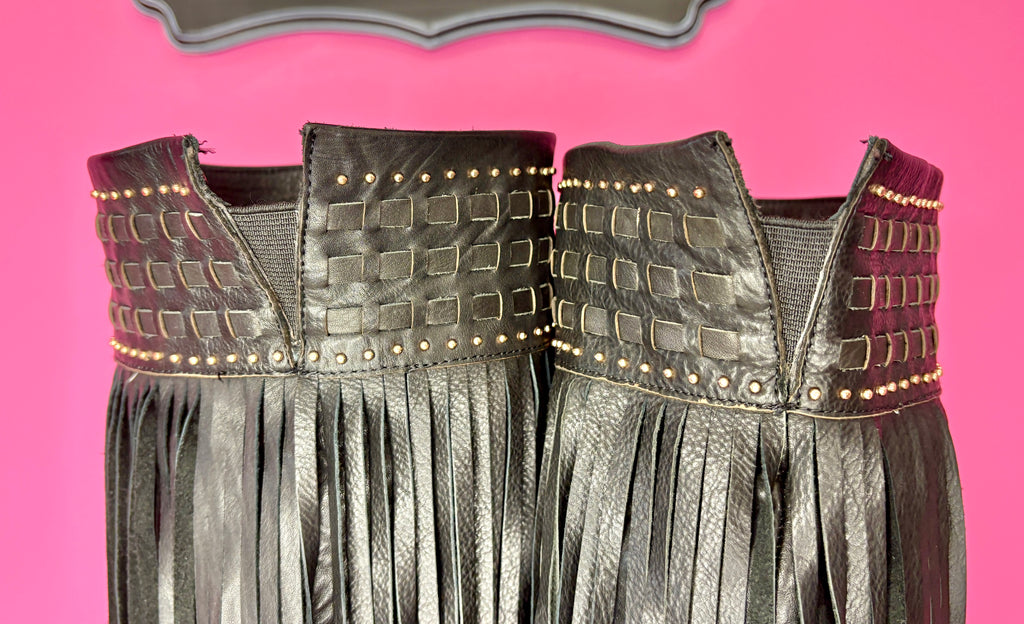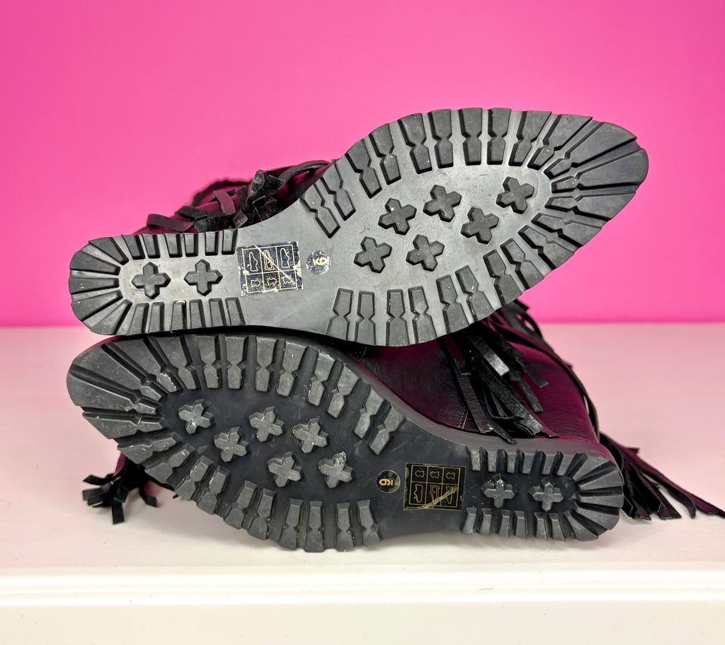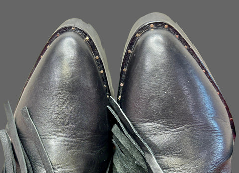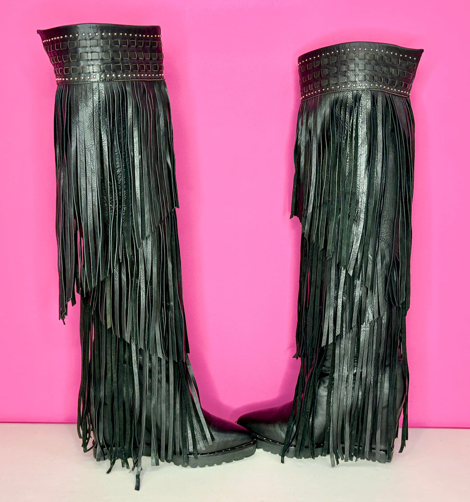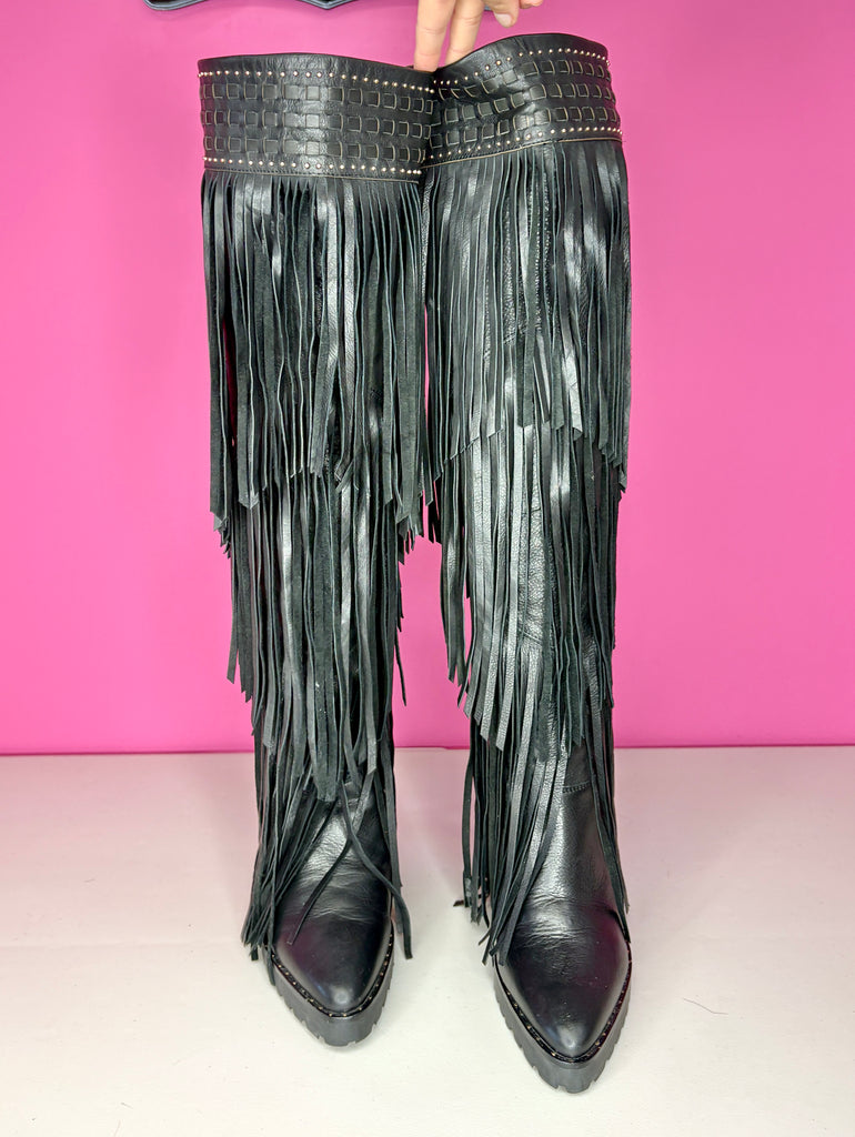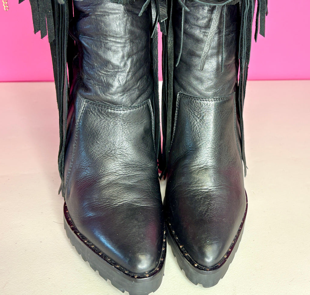FEATURES: Let's face it, Designer Ivy Kirzhner can be super expensive - Try almost $1,000 for these boots!!! So here's your chance to own these kick a$$ Luxury boots at a fraction of their retail price. Western vibe with their jet black premium pebbled leather, fringe detailing, tall shaft, woven and stud detail, almond toe, hidden wedge and rubber sole. Perfect for line dancing or pair with Boho Dresses. Made in Brazil.