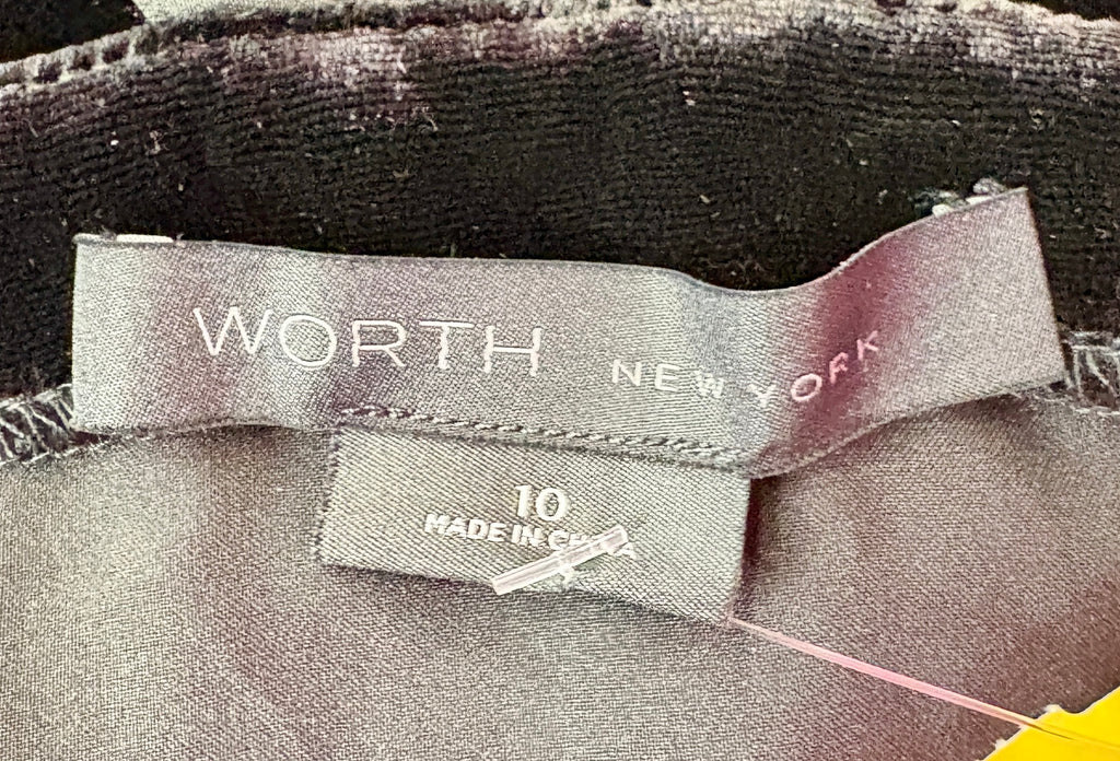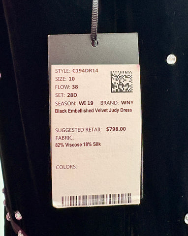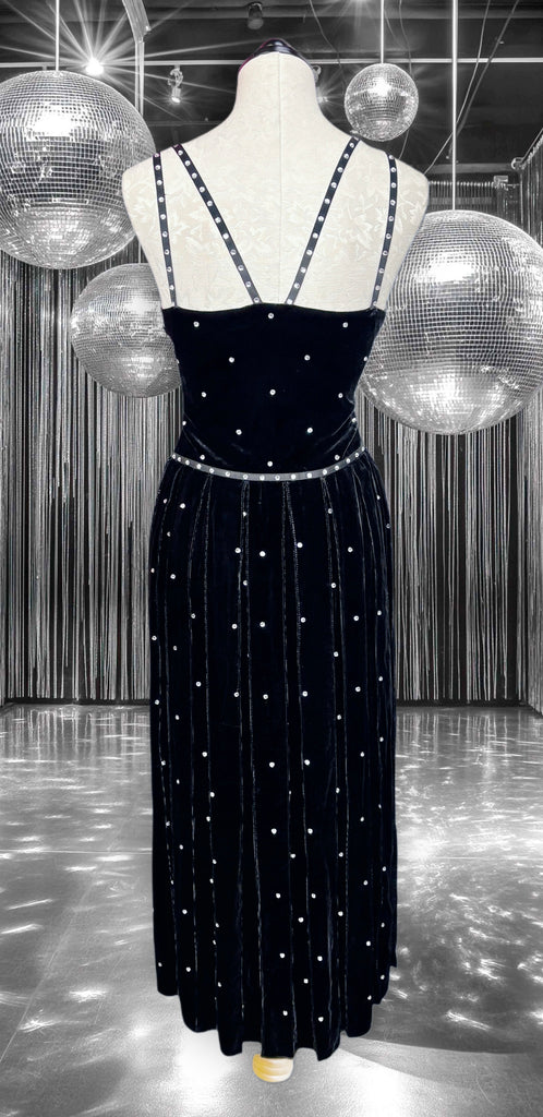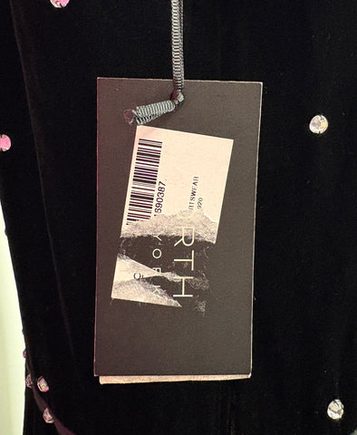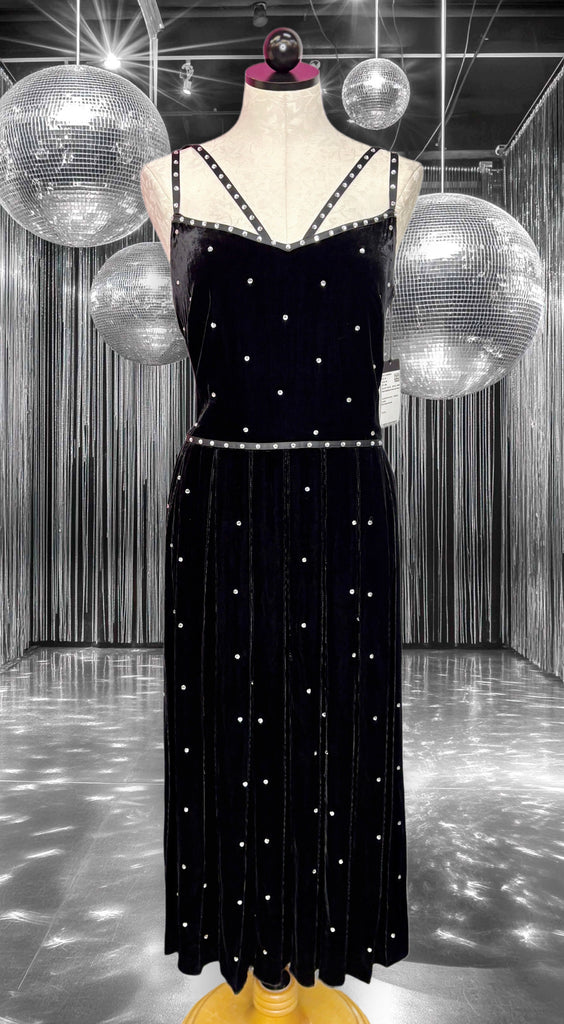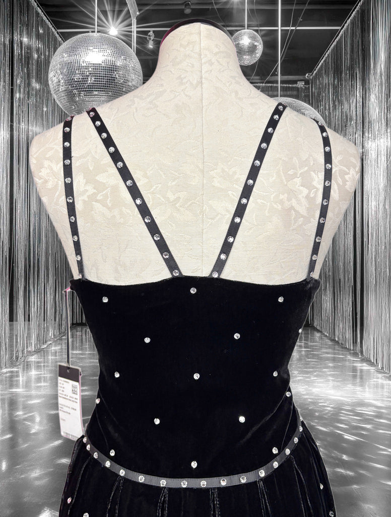 FEATURES: Absolutely Stunning BRAND NEW Worth New York Couture Judy Dress. Done in Jet Black Velvet with all over Rhinestone Studding to add a bit of bling. (See Pics). Unique rhinestone studded strap detail at bodice and waist. Perfect Midi length and hidden side zipper. 82% Rayon; 18% Silk. Original Retail $798.