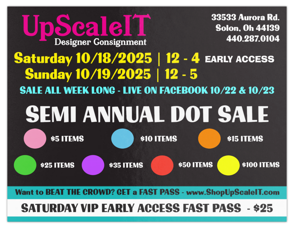 DATE/TIME: This Purchase will get you on our VIP EARLY ACCESS LIST and will allow you to SHOP the UpScaleIT DOT SALE an entire day EARLY!!!