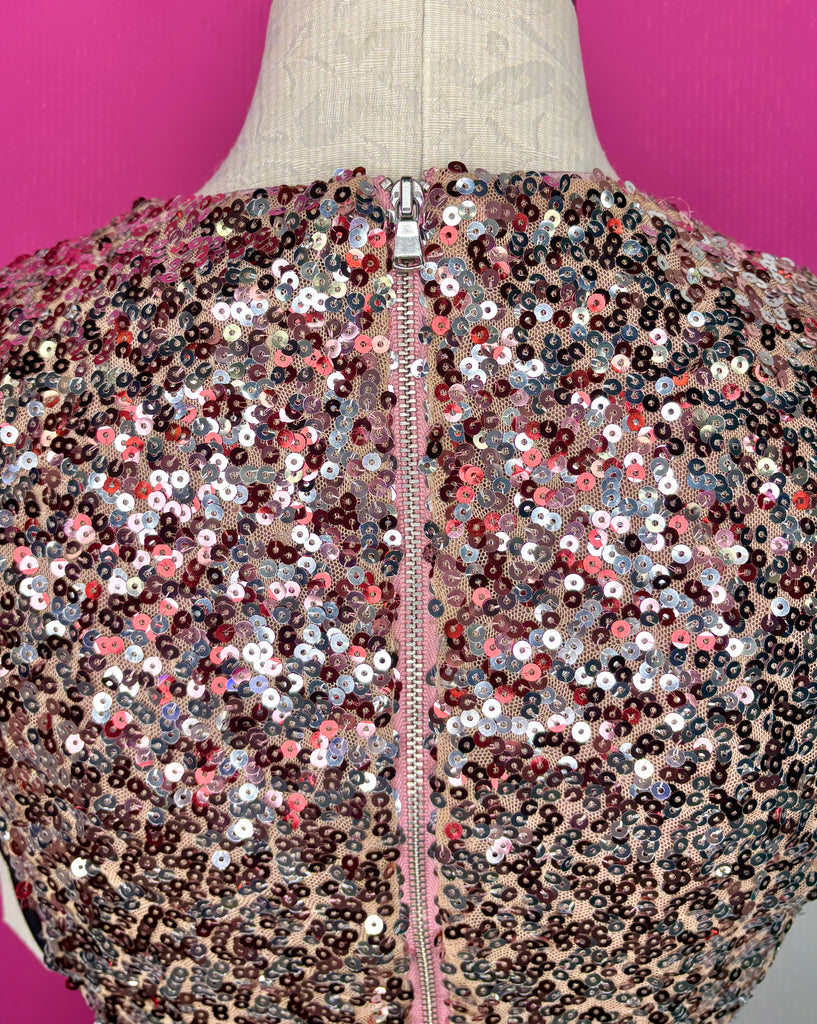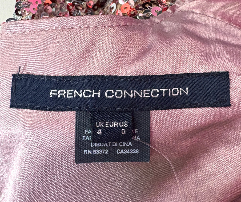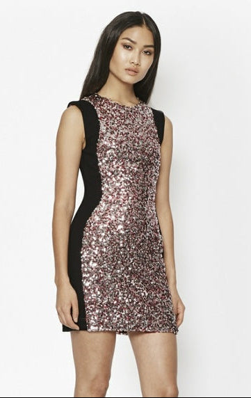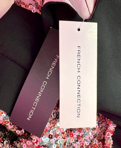 FEATURES: This BRAND NEW French Connection Rose Sequin dress is Absolutely Stunning. This curve-enhancing dress features a full sequin front and back in Rose Gold with contrasting black side panels for a sculpted silhouette and exposed back zipper. Sexy, bodycon, flattering stretch fit through the chest, waist, and hips, and a chic 32" length perfect for parties, events, and nights out. Original Retail $250.