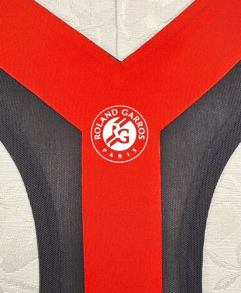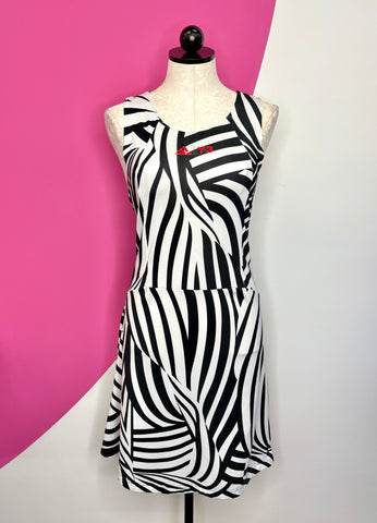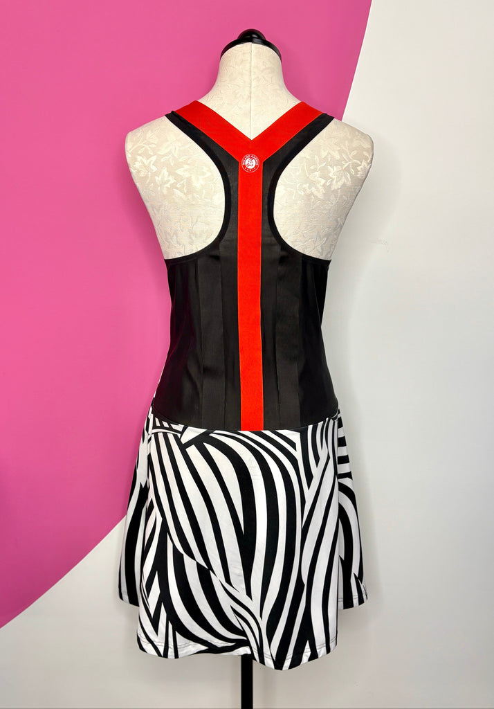 FEATURES: Adidas paired with Ana Ivonovic/Roland Garros to create a Limited Edition Memorable tennis line. This Y-3 dress combines classic black and white in a zebra stripe and red faux suspenders topped off with Roland Garros Paris logo at back and the Adidas/Y-3 logo on the front. Climalite tech with razor back and flounce skirt. Perfect for on the Court time! Original Retail over $300!!!