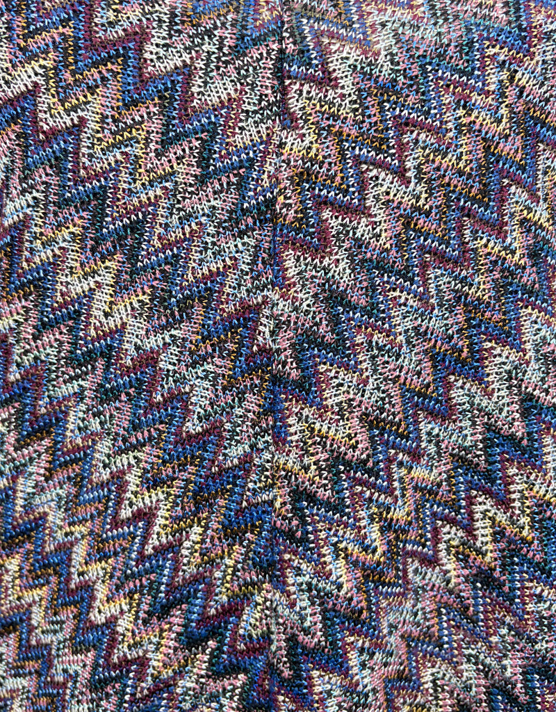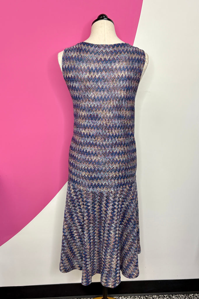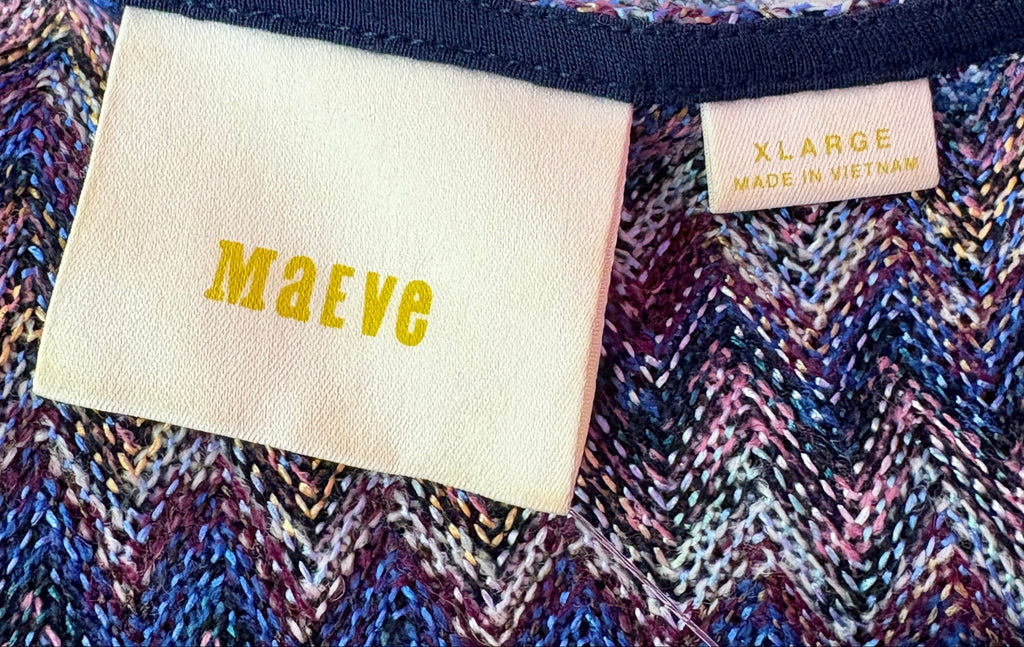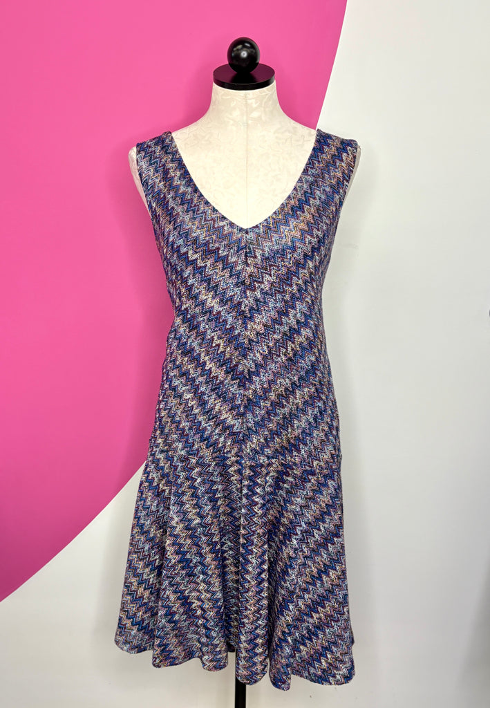 FEATURES: This is the Anthropologie Maeve Westwater Knit Dress, featuring a lightweight knit chevron pattern in purple and blues, a sexy v-neckline, an A-line dropped waist silhouette with a flounce hem. Original Retail $138.