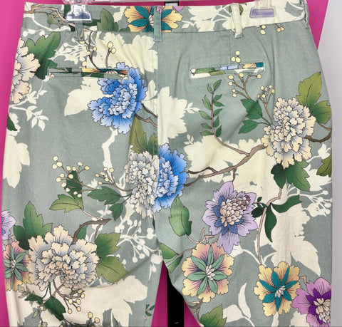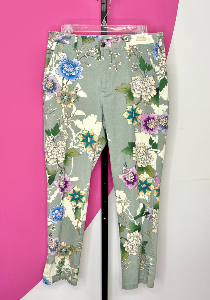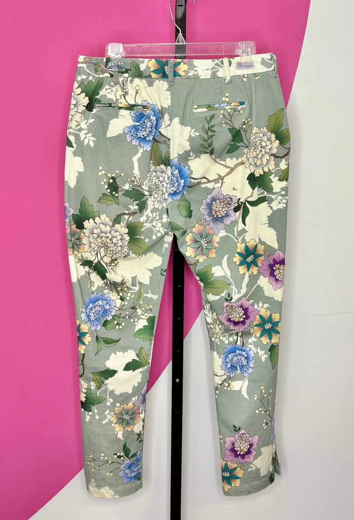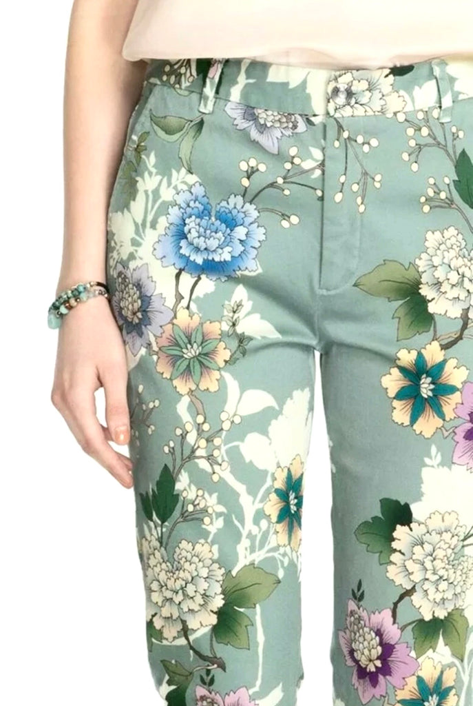 FEATURES: These floral trousers are in a soft sage green with a vibrant multicolor botanical print. Slim, flattering silhouette with a tailored waist, zip fly, crop length, pockets and button closure. Lightweight and comfortable—perfect for dressing up or down.