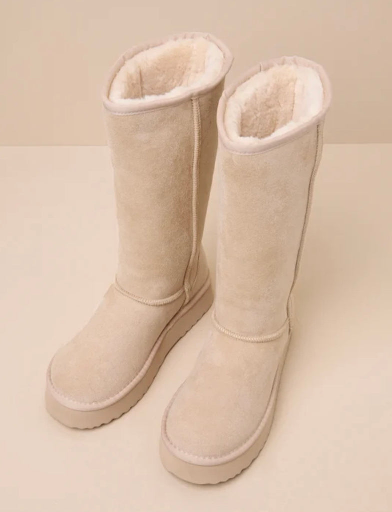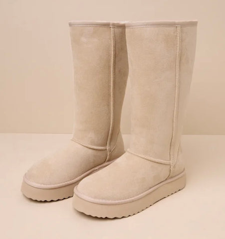 FEATURES: The coldest seasons just got a whole lot cuter thanks to the Beach by Matisse Sun Valley Natural Suede Faux Fur Platform Knee-High Boots! Soft faux suede shapes these must-have boots that feature a rounded toe upper, a seamed vamp, and an 11.5" knee-high shaft with a 15.5" circumference. Ultra-soft faux fur lines the classic silhouette for an extra cozy touch. Easy slip-on design and trendy platform sole complete the look. Available in whole sizes only.