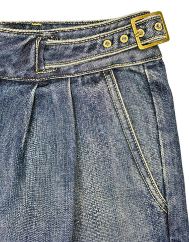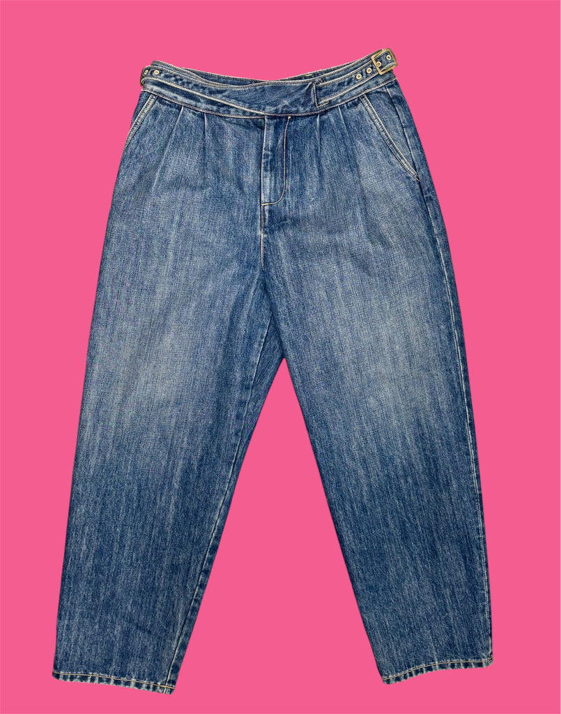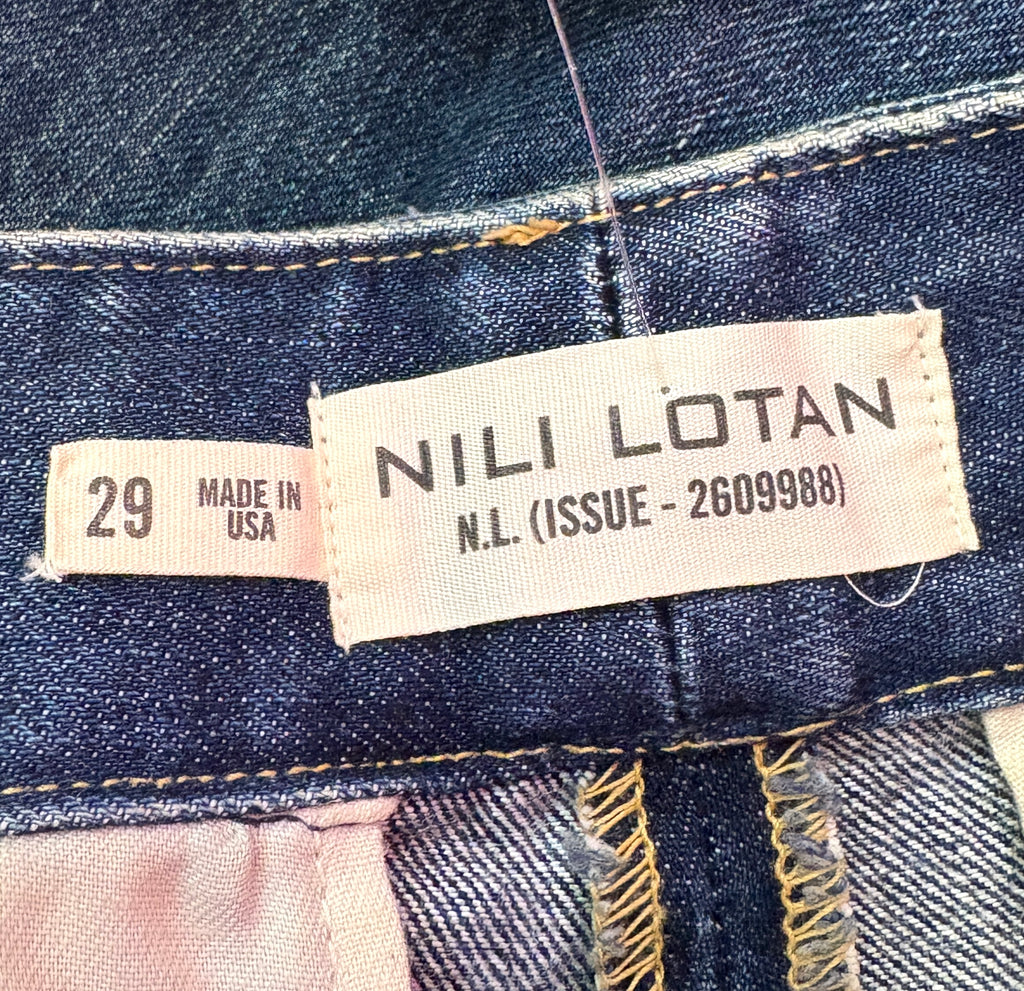 FEATURES: Chic and effortlessly cool Nili Lotan Zora jeans featuring a relaxed tapered silhouette with soft structure and beautiful drape. Designed with pleated front detailing for a flattering, fashion-forward shape, adjustable side waist tabs with buckles, and a classic zip-and-button closure. Crafted in premium mid-wash denim with subtle fading for a worn-in, elevated casual look. Perfect for pairing with tucked-in blouses, knits, or tees for a polished yet laid-back vibe. Original Retail $425.