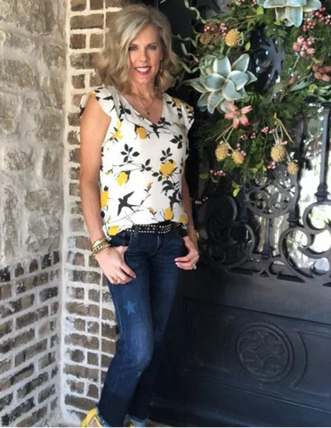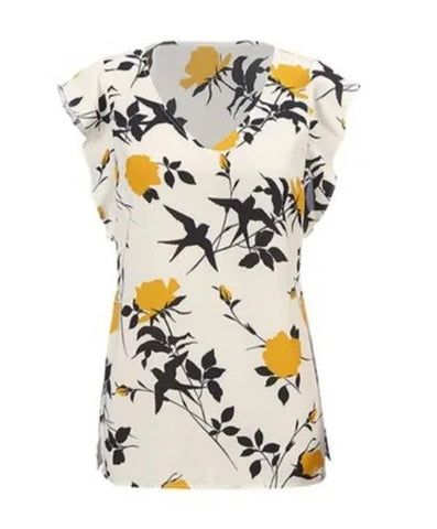 FEATURES: With its unique swallowtail floral print, the Cabi Birdwatcher Top is sure to get you spotted. This delicate top features fluttered cap sleeves and dashes of gold against a cream background.