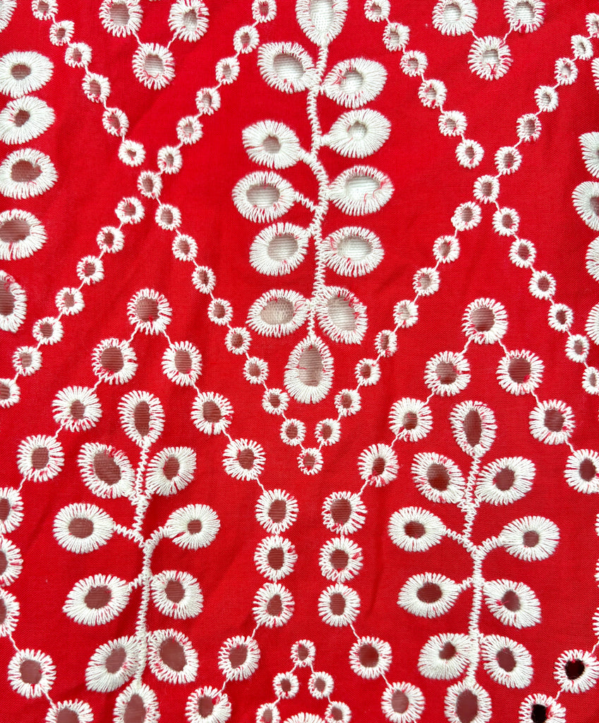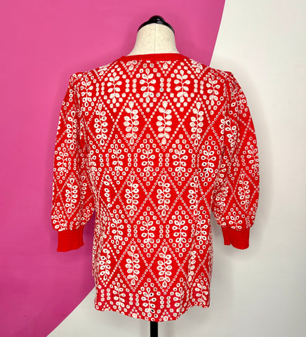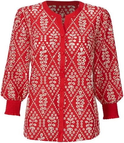 FEATURES:  From the Spring 2022 Cabi Collection comea the Limited Edition Lyric Top.   The Lyric Top offers a fresh take on a springtime classic: eyelet. This top features three-quarter-length sleeves, a button-front design, and white embroidery adorning a gorgeous crimson hue. Easy fit, solid red banding at the neck and cuffs, elastic shirring at the cuffs, hits at the high hip.