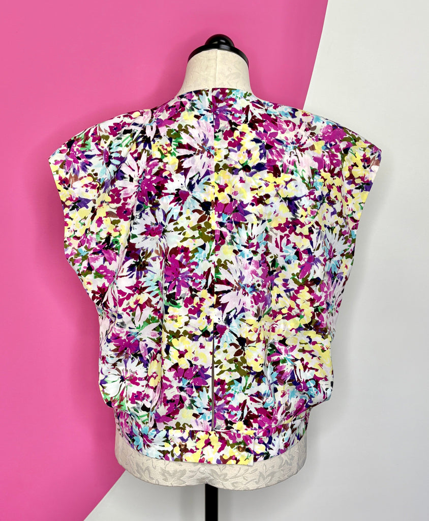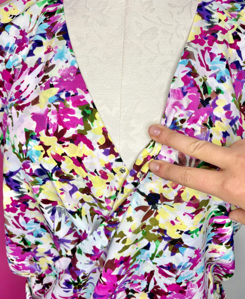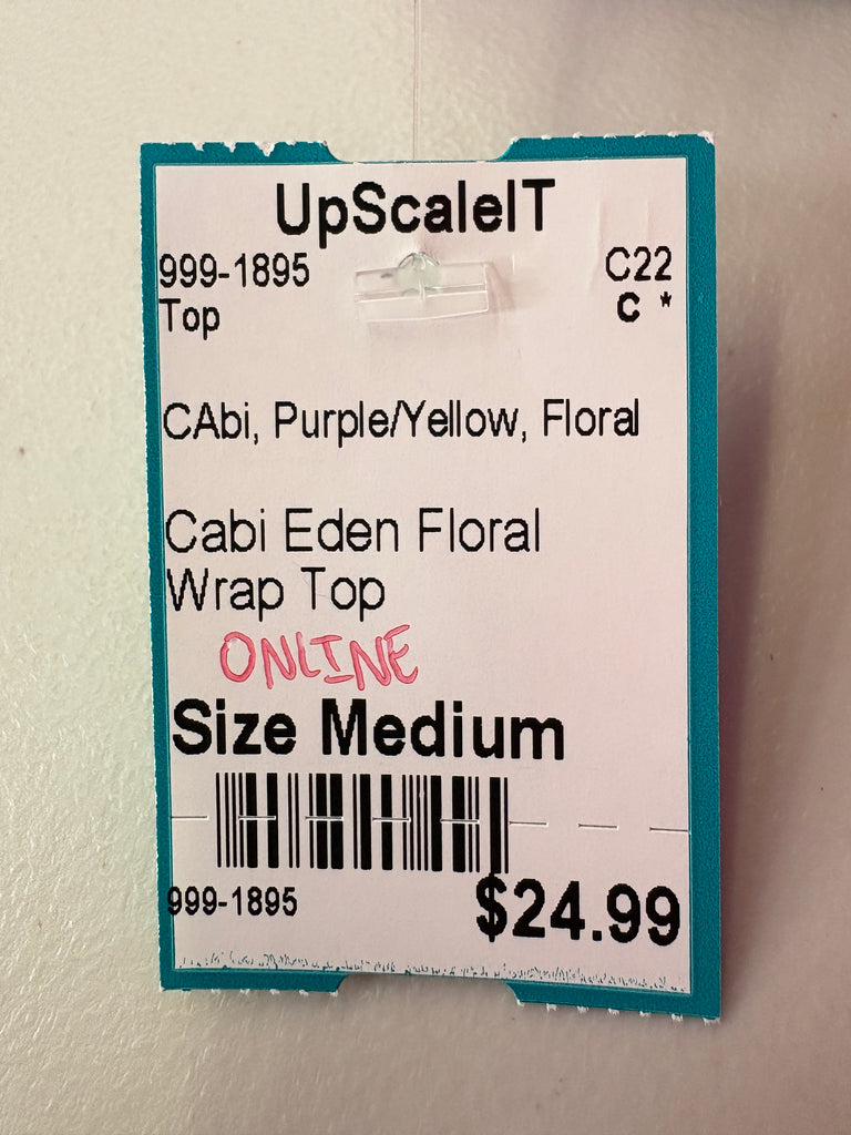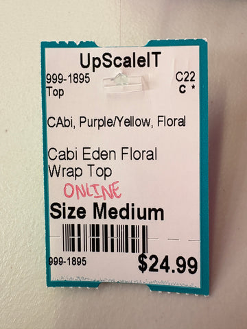 FEATURES:  This Cabi Eden Top is just beautiful with its all over floral in hues of purple, pink, blue, white & yellow.  Wrap styling with snap closure, 2 buttons at the waist for a more slimming look and capped sleeves. 100% Polyester.