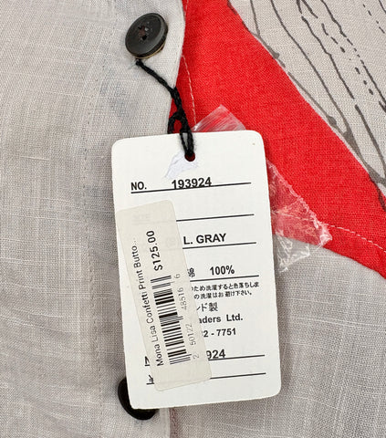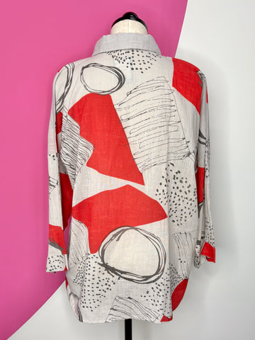 FEATURES: This BRAND NEW Mona Lisa Confetti Print Shirt features a unique Random Paint Print design that adds a touch of artistic flair to your ensemble. 3/4" sleeves, buttons down the center and longer length. Oversized Fit 100% Cotton. Original Retail $125.