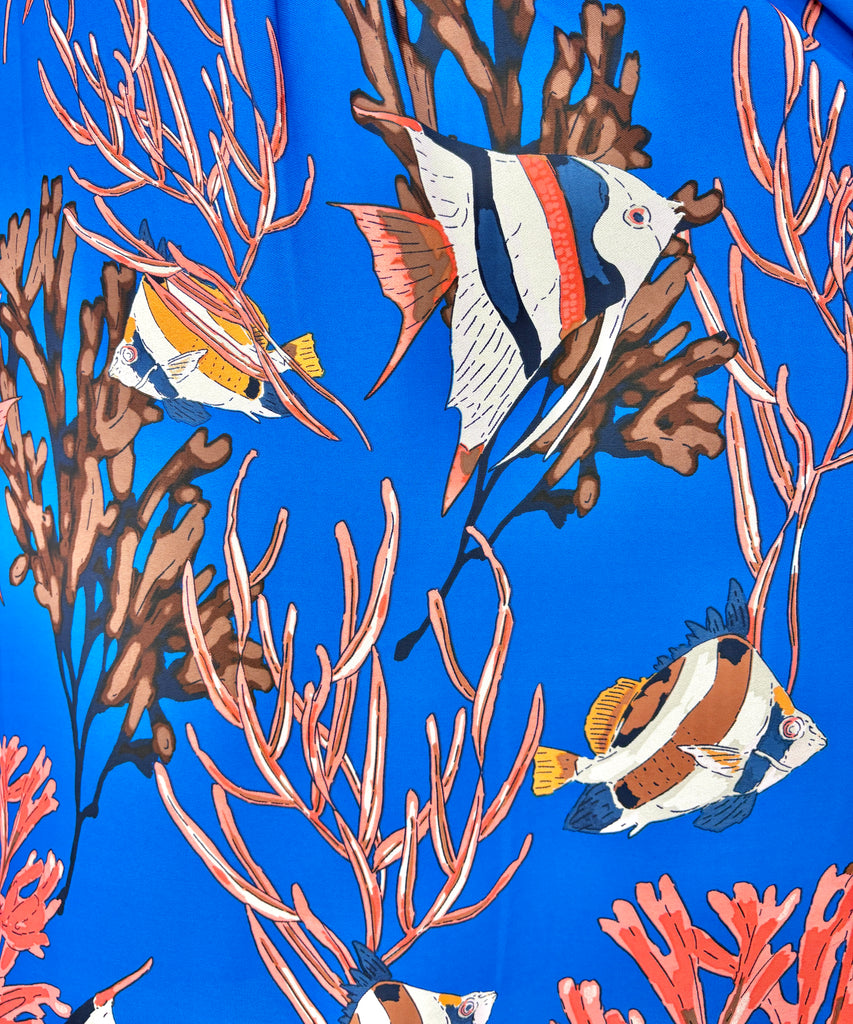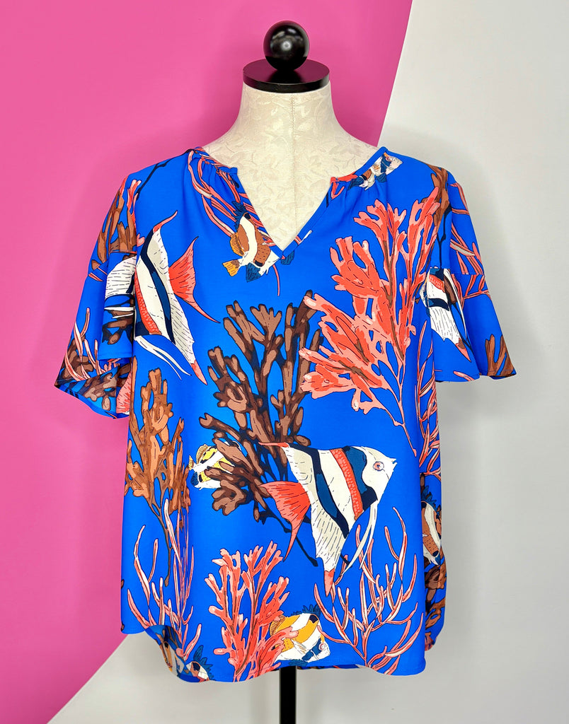 FEATURES: Under the Sea print adorns this Playful Nic + Zoe Top. Beautiful blue sea shade background with all over Angelfish & Coral. Short flutter sleeves, split neckline, 100% Polyester.