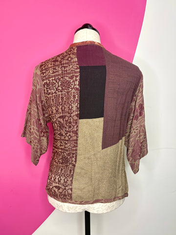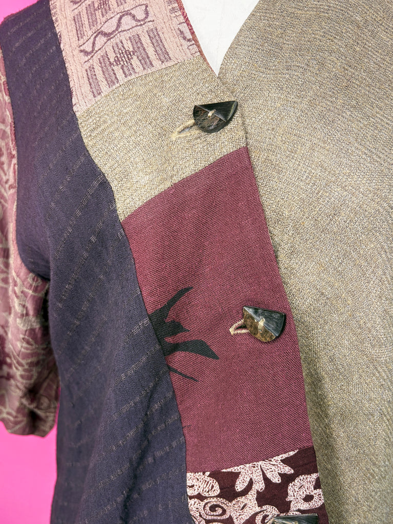 FEATURES: This vintage Donna Jessica top features a unique patchwork design with mixed textures and earthy tones, including patterned panels and semi-sheer sleeves. The asymmetrical button closure adds an artistic touch, while the lightweight fabric and relaxed fit make it comfortable and easy to style. A distinctive and expressive piece perfect for vintage lovers. Tag Size 0, which easily fits a Ladies Size XS/S.