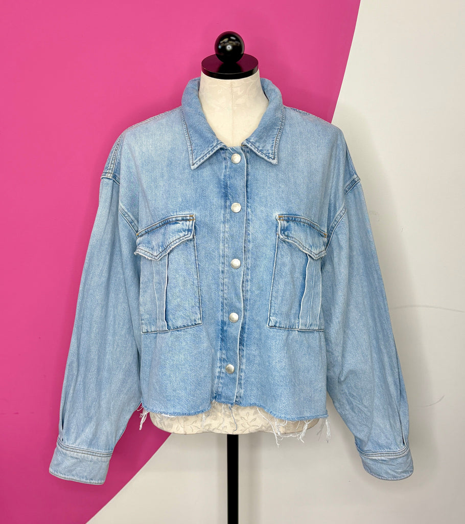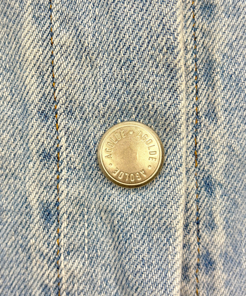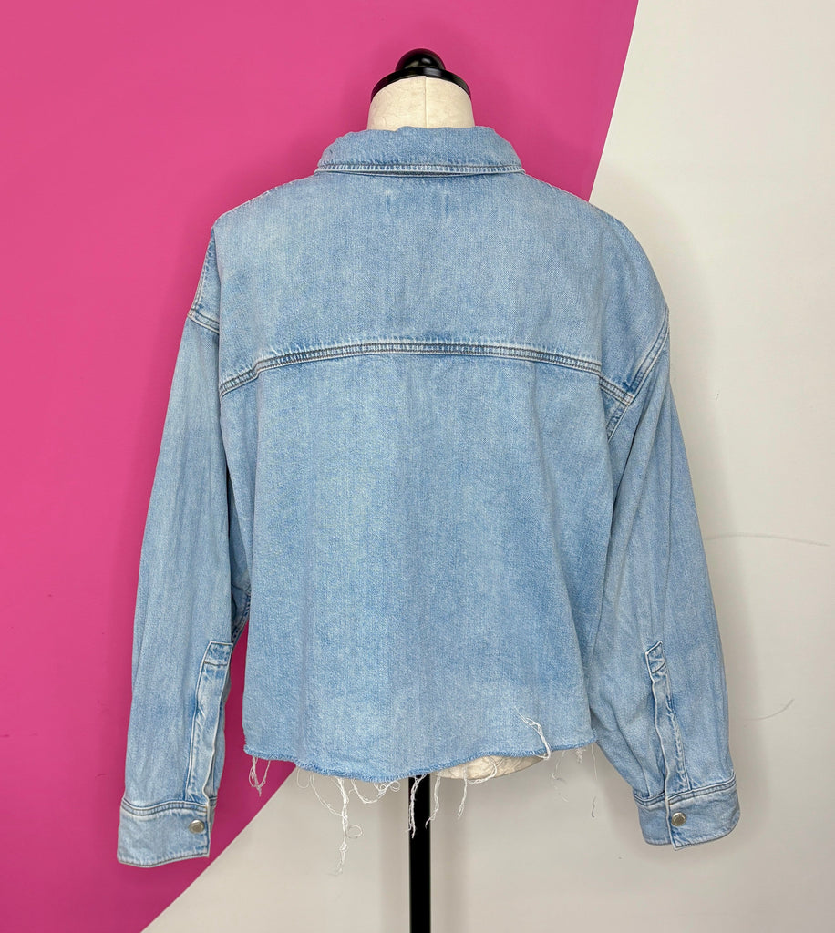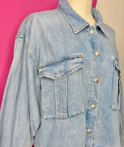 FEATURES:  Setting the standard for modern denim, all of Agolde's designs are fit-tested and crafted from premium fabric. Made from light-medium wash denim, the Nyx shirt is cut into a boxy fit and has a buttoned placket and raw hem.  Runs Oversized.  Original Retail $287.