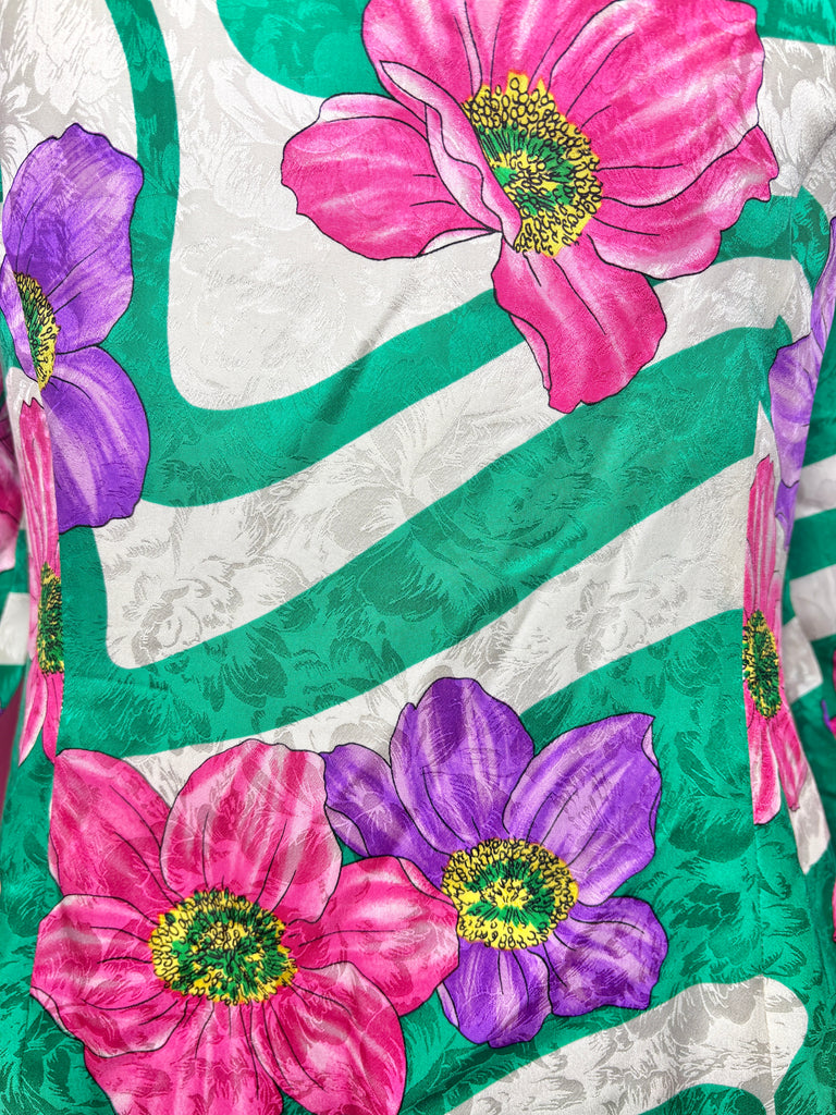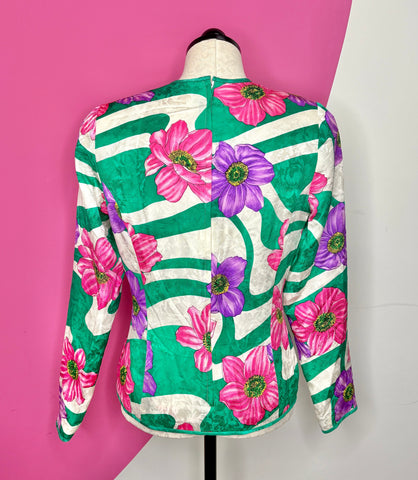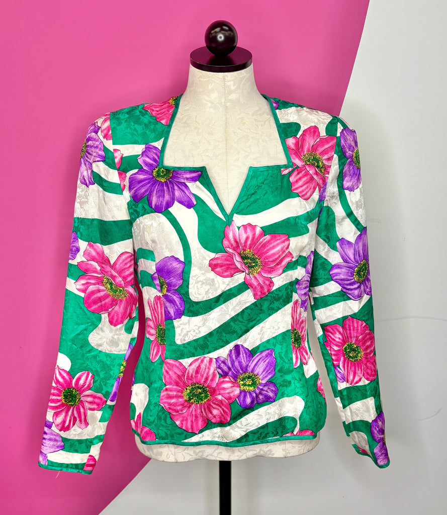 FEATURES: This Anne Crimmins Vintage Masterpiece is made of 100% Premium Silk. It's covered in a subtle texture and features a vibrant floral print in hues of pink and purple large blossoms set against bold green and white abstract stripes. Designed with a unique notched V-neckline and long sleeves, it offers a lightweight, elegant feel perfect for standout styling. The piece is fully lined, has a zipper at the back and has shoulder pads, which makes it both structured and chic. Would look great with your favorite wide leg jeans.