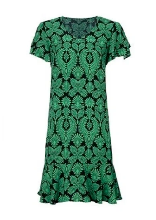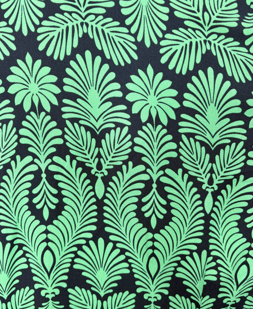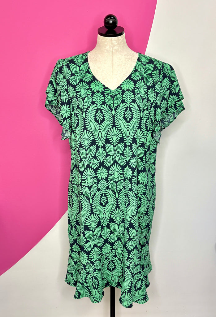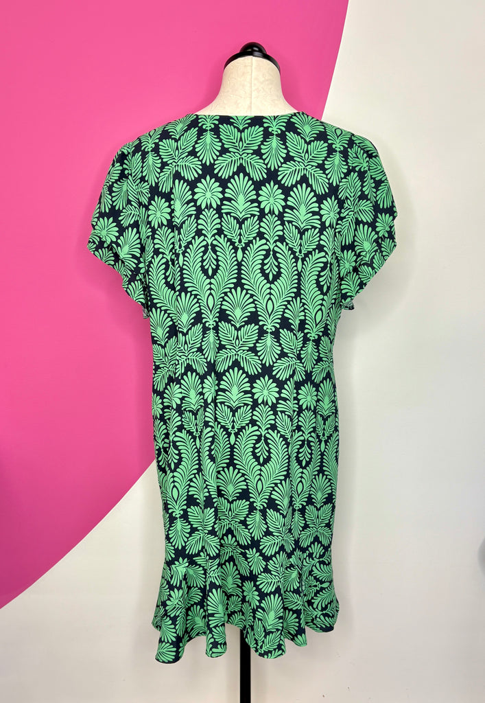 FEATURES: Elevate your wardrobe with the Cabi Palmette Dress, Style #6415—a standout piece from Cabi's Spring 2023 collection. This dress features a vibrant green and navy palm damask print, offering a tropical flair that's perfect for various occasions. Designed with flutter sleeves and a flounce hem, it provides a feminine and flattering silhouette. Original Retail $149.
